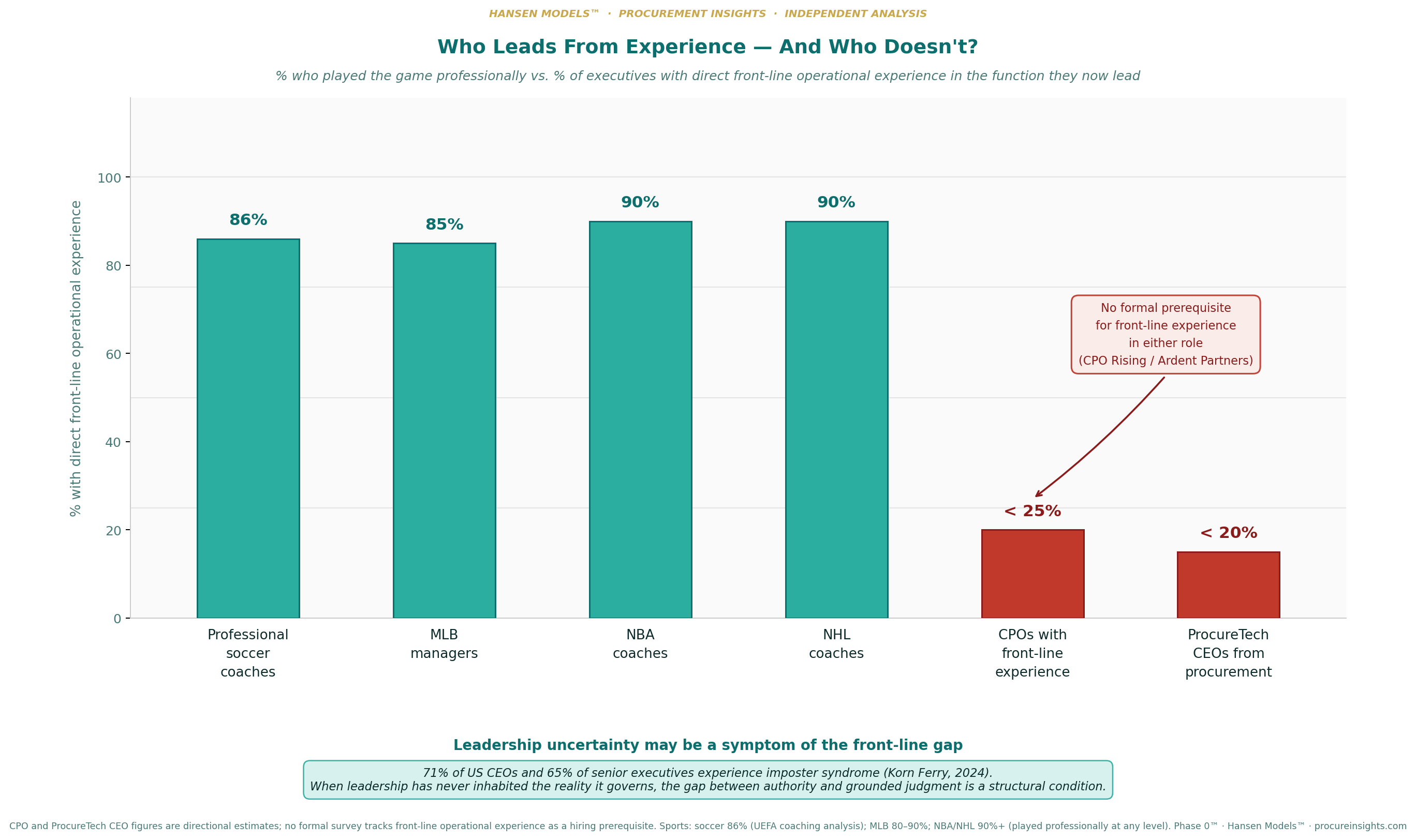 Bar chart comparing percentage of professional sports coaches who played professionally (85–90%) versus CPOs and ProcureTech CEOs with front-line operational experience (under 25%), with Korn Ferry imposter syndrome callout.