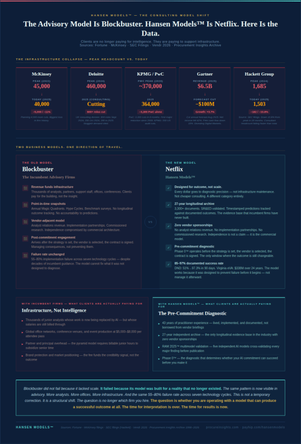 The Hansen Models™ team has been living this reality for 43 years. We successfully implemented it 27 years ago at the Department of National Defence — moving delivery performance from 51% to 97.3% in 90 days, sustained for seven consecutive years, before any of today’s AI platforms existed. We have been meticulously covering, assessing, and documenting it for 18 years across 3,300+ independently produced archive entries, with zero vendor sponsorships and zero paid analyst relationships.
