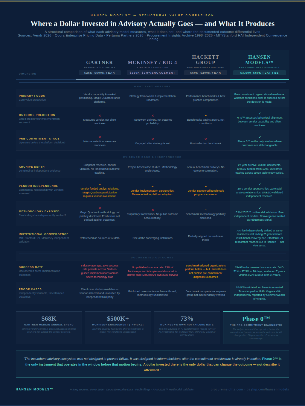 Hansen Models™ is a different model entirely. Designed for outcome, not scale. Every dollar goes to diagnostic precision — not infrastructure maintenance. This is not a cheaper version of what the incumbent firms offer. It is a different category — the pre-commitment diagnostic that the incumbent advisory model was never designed to provide and cannot provide without dismantling the commercial architecture that funds it.