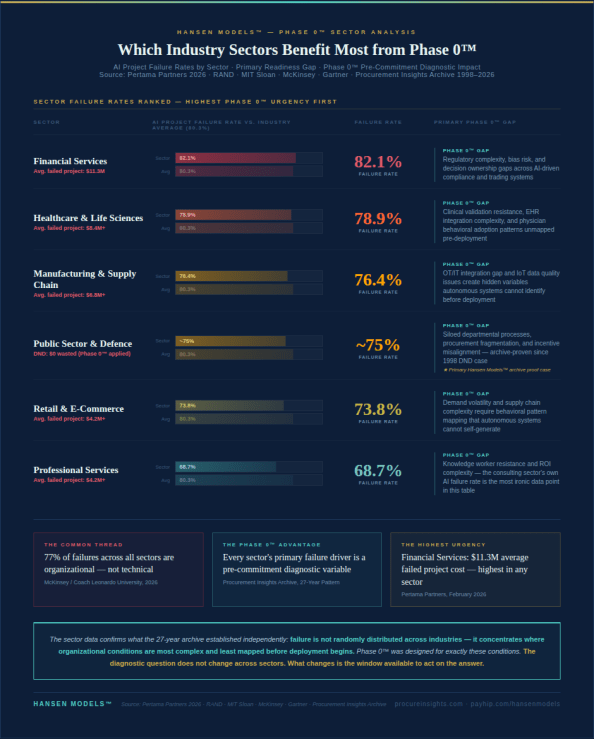 The common thread across every sector: 77% of failures are organizational, not technical. And every sector’s primary failure driver maps directly to a Phase 0™ pre-commitment diagnostic variable.