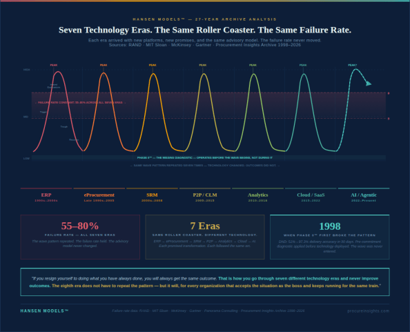 The 27-year Procurement Insights archive has documented this pattern across every technology cycle since the late 1990s. Zero vendor sponsorships. Zero paid analyst relationships. The conclusion has been consistent from the first entry to the last: organizations do not fail because the technology does not work. They fail because they deploy it into conditions that cannot sustain the outcome.