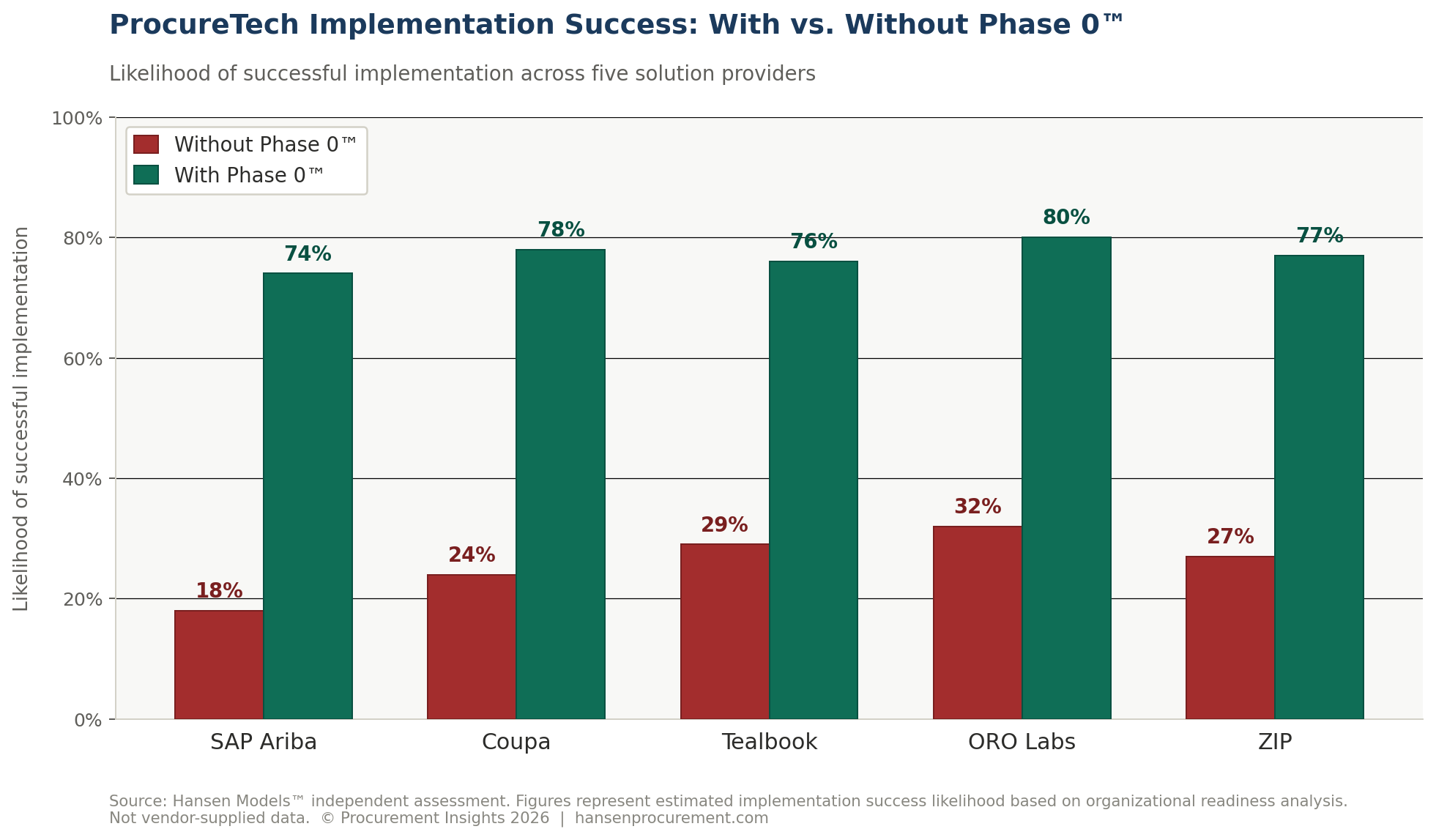 Likelihood of successful implementation across five solution providers — SAP Ariba, Coupa, Tealbook, ORO Labs, and ZIP — based on Hansen Models™ independent organizational readiness assessment. Not vendor-supplied data.
