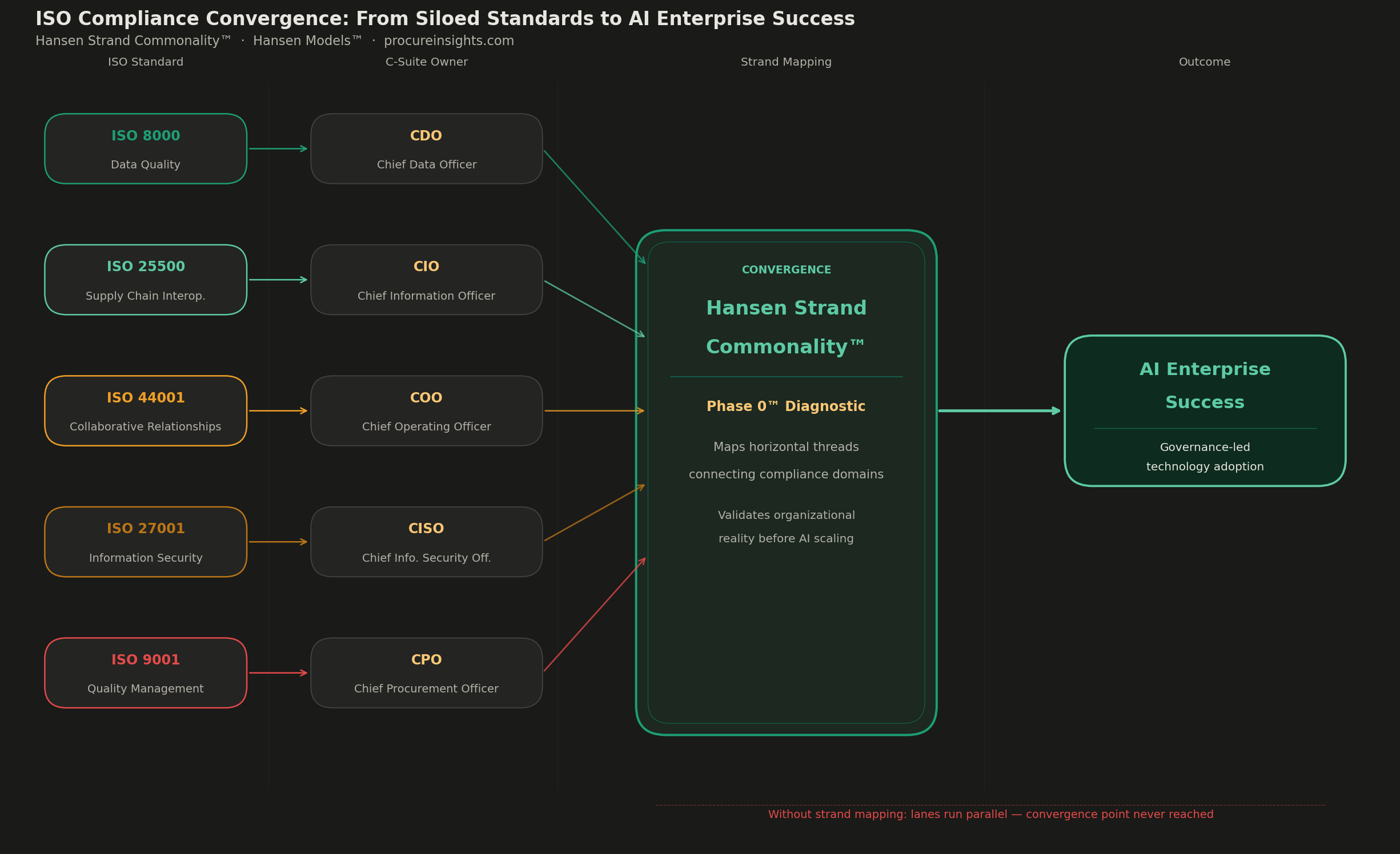 The reason it doesn’t get asked is the same reason most transformation initiatives fail before they begin: organizations view ISO standards the way they view organizational charts — as independent lines of authority, each with its own owner, its own metrics, and its own definition of success. The CDO owns data quality. The CIO owns technology infrastructure. The COO owns operations. The CPO owns procurement. The CISO owns security. Each pursues compliance within their lane.