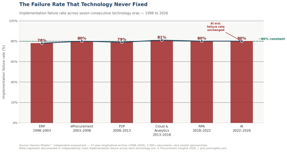 Across seven consecutive technology cycles since 1998 — ERP, eProcurement, P2P, cloud suites, analytics, RPA, and now AI — the archive documents the same pattern holding at 80 percent. The technology has changed in every cycle. The failure rate has not.