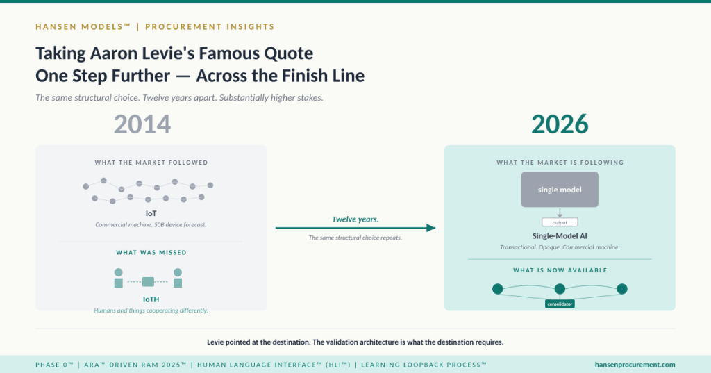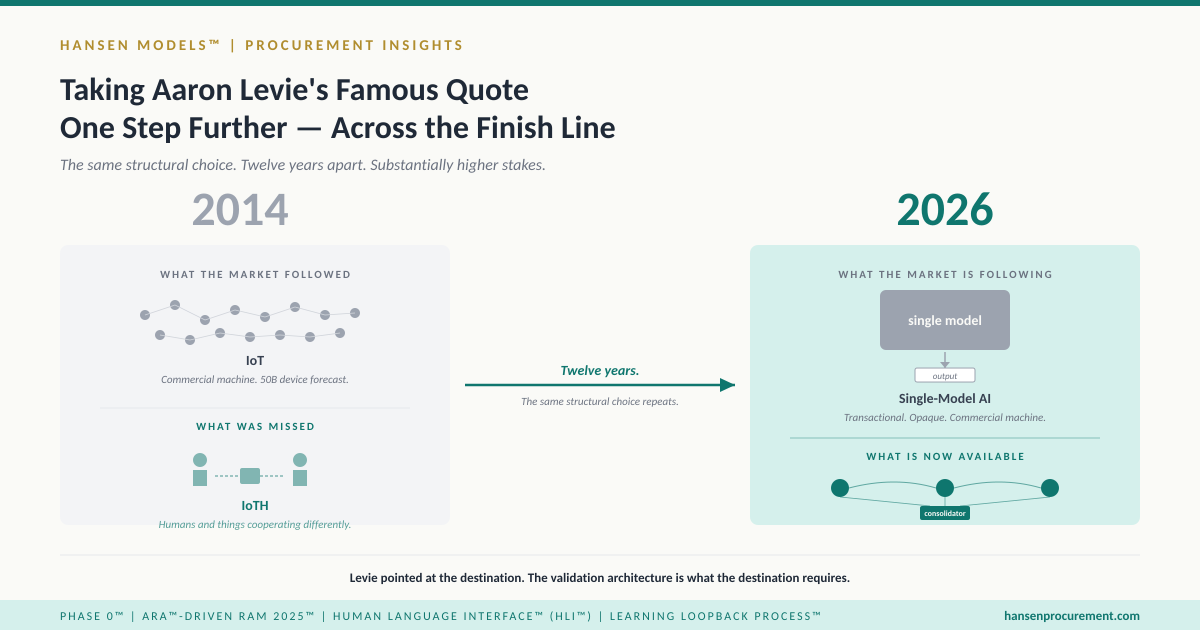 The second piece, published the same day, established a dedicated section of the Procurement Insights blog around the Internet of Things and Humans framing. The IoTH framing came from Tim O’Reilly’s April 2014 Forbes article and made an architecturally specific move: “so many of the most interesting applications of the Internet of Things involve new ways of thinking about how humans and things cooperate differently when the things get smarter.” That sentence — written twelve years ago, about a different technology — is the early articulation of what the orchestration-transparency post calls human-agent logic. The vocabulary has evolved. The architectural claim has not. What was named conceptually in 2014 as humans and things cooperating differently is now operationalized in ARA™-driven RAM 2025™ through the Human Language Interface™ (HLI™) — the natural-language layer through which human agents direct multi-model substrates without specialized prompts or learned syntax.