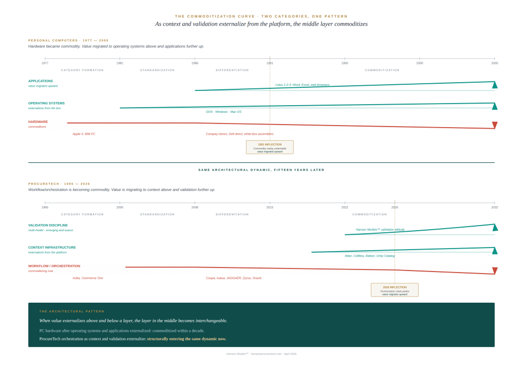 Two timelines, fifteen years apart, same architectural dynamic. When value externalizes above and below a layer, the layer in the middle becomes interchangeable. PC hardware traveled this trajectory from 1977 to 2000. ProcureTech orchestration is structurally entering the same trajectory now. The practitioner who recognizes the shift first is no longer evaluating vendor differentiation claims inside the vendor’s preferred frame. The practitioner is positioned to ask the architectural question the vendor-controlled frame has been structurally suppressing.